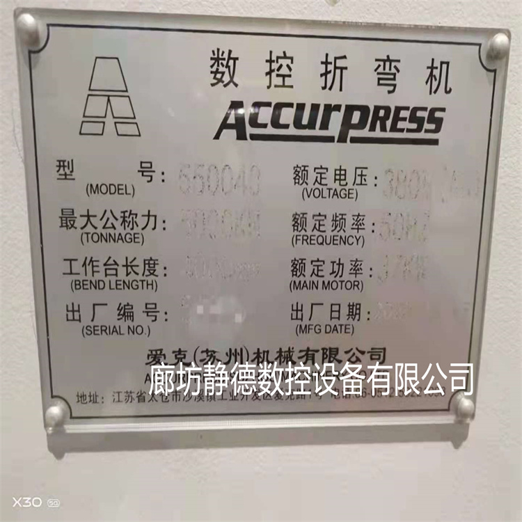 出售转让_高性价比_精品二手 爱克数控折弯机550040,型号550040,折弯压力 500吨,加工长度4米 , DA53S系统, 四加一轴,2020年产 ,成色:全新,带挠度补偿! 该数控折弯机购入后,干了没有几天,厂子就倒闭了,成色非常新,机会难得,预购从速!已经调试完毕,保证精度,可现场试机,我公司免费安装、调试、培训,保修三个月,24小时技术支持,终身配件供应。