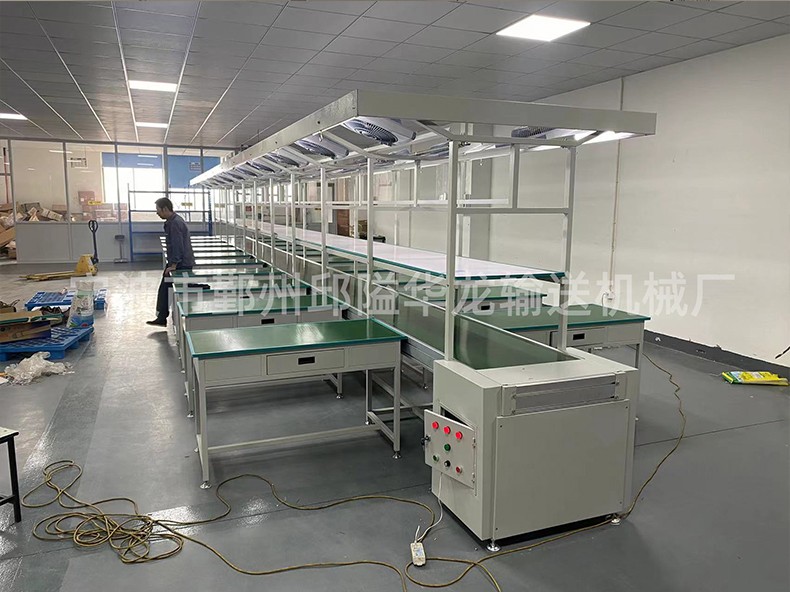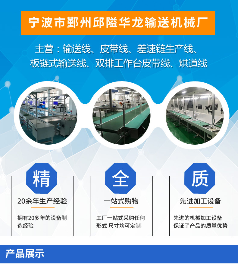 我厂是集科、工、贸一体,专业设计制造各种类型输送线、皮带线、差速链生产线、板链式输送线、双排工作台皮带线、烘道线等产品的企业。用户可以根据企业及厂房的基本色调自选色泽,从而达到浑然一体的效果。