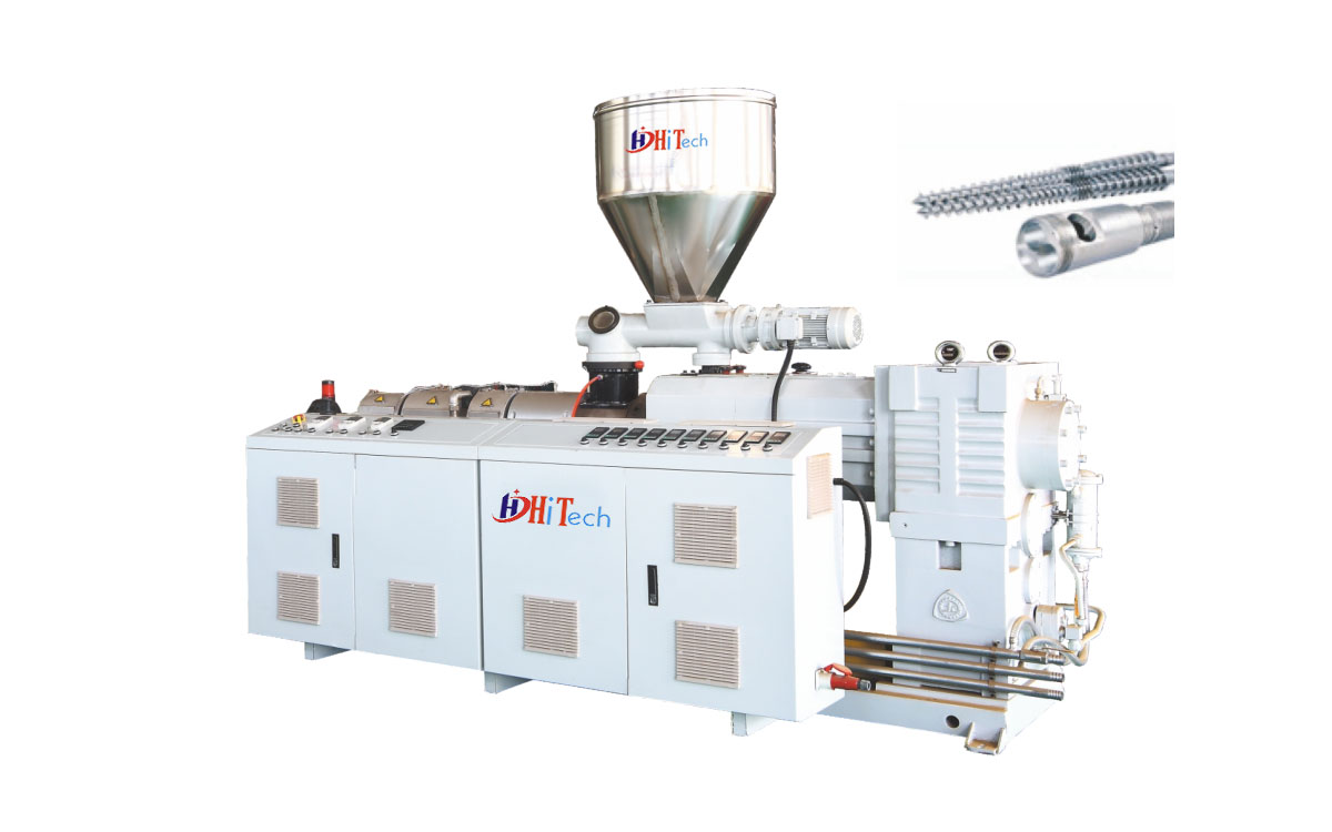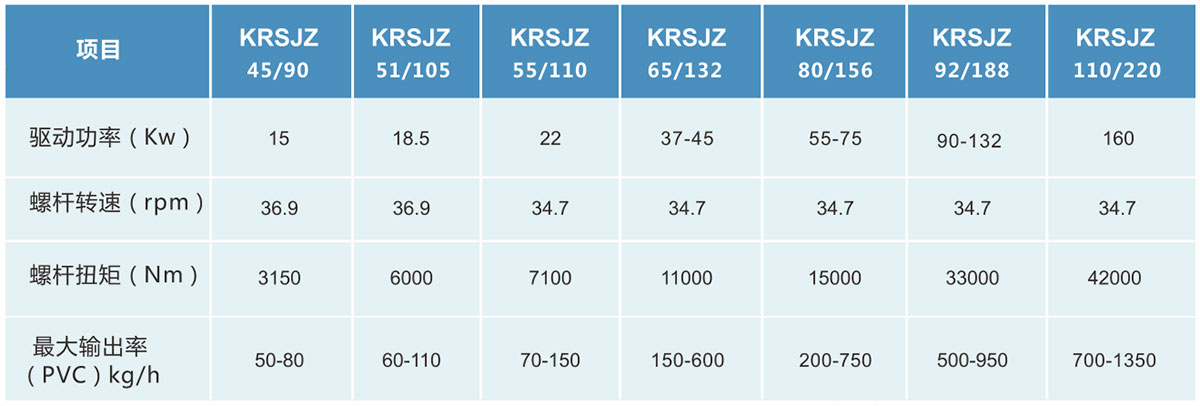 kRSJZ型系列锥形双螺杆挤出机,是一种适台于各类PVC粉抖挤出成型的专 用设备。KRSJZ系列新型高 效锥形双 螺杆挤出机是一种高 效的混炼、挤出设备,具有剪切速率小,物料不易分解,塑化混炼均匀, 产量高,质量优,自 洁性好,适用范围广,使用寿命长等优点。本机用途广泛,配备相应的螺杆、机头、辅机可将各种热塑性塑料、热 固性塑料和改性塑料从粉末状态直接挤制成PVC管材、异型材、板材、片材、木塑、发泡片板材、棒材及造粒、薄 膜,中空等其它塑料PVC制品。螺杆采用油冷却系统、水冷却系统冷却。机筒采用特殊设计的油冷/风跨系统冷却, 具有维修方便等优点,冷却系统设计特殊,散热面积格外加大,冷却迅速,温度精度可达+1°C。减速箱采用立式或 卧式结构,结构更紧凑,可靠性更高,适用于PVC材料的加工。真空排气, HPVC粉料可直接成型,效果良好。采用 PLC自动温控,常规设备采用温控表控制,经济实用,便于操作。