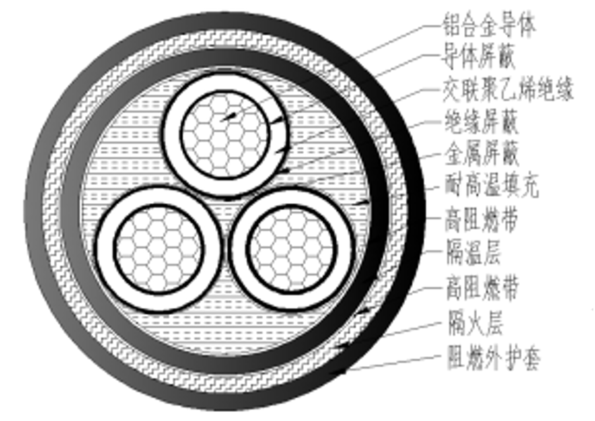 为保护绝缘的电气性能,采用综合防火层隔离火源,阻挡火焰热量进入绝缘内部,从而起到耐火作用。防火层是采用一种在火焰高温下会变硬、结壳的陶瓷化硅橡胶材料,其价格成本非常昂贵,导致中压耐火电缆价格非常高。