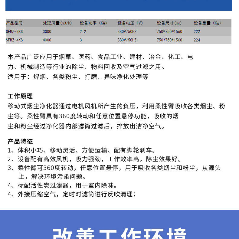 3、柔性臂可360度转动,任意位置悬停,用于吸收各类烟尘和粉尘,从源头上,解决环境污染问题。