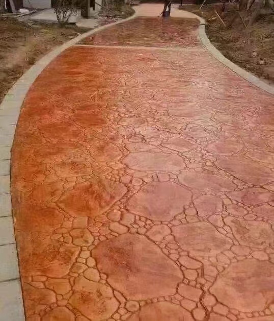 压模混凝土是在未干的水泥地面上加上一层彩色强化料(起装饰和强化混凝土作用)及着色脱模粉(起二次着色和脱模作用), 然后用专用的模具在水泥地面上压印而成。