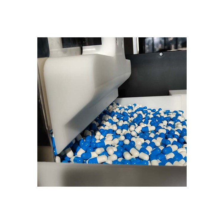 专用胶囊外观检测机用于对各种尺寸、颜色和形状的胶囊进行表面视觉检测和分检。把胶囊经过自动上料器倒入料斗中,采用定制的照明系统与多个彩色 相机对胶囊进行检测,通过高速处理器对采集的图像进行分析,不合格品被剔除,合格品进入下一工艺环节。软件操作简单,易上手,设计符合人体工程学,配件较少,简化了更换模具、清洁、维护的工作。