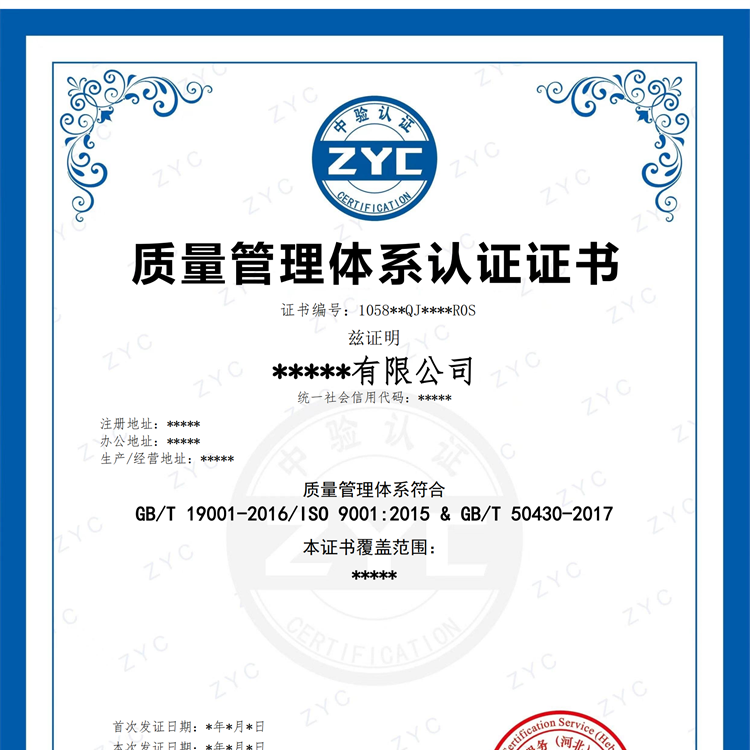 六、依据《质量管理体系要求》和GB/T50430-2017《工程建设施工企业质量管理规范》》标准实施的认证活动,认证证书标注的认证依据标准应为:GB/T19001-2016/ISO9001-2015和GB/T50430-2017。