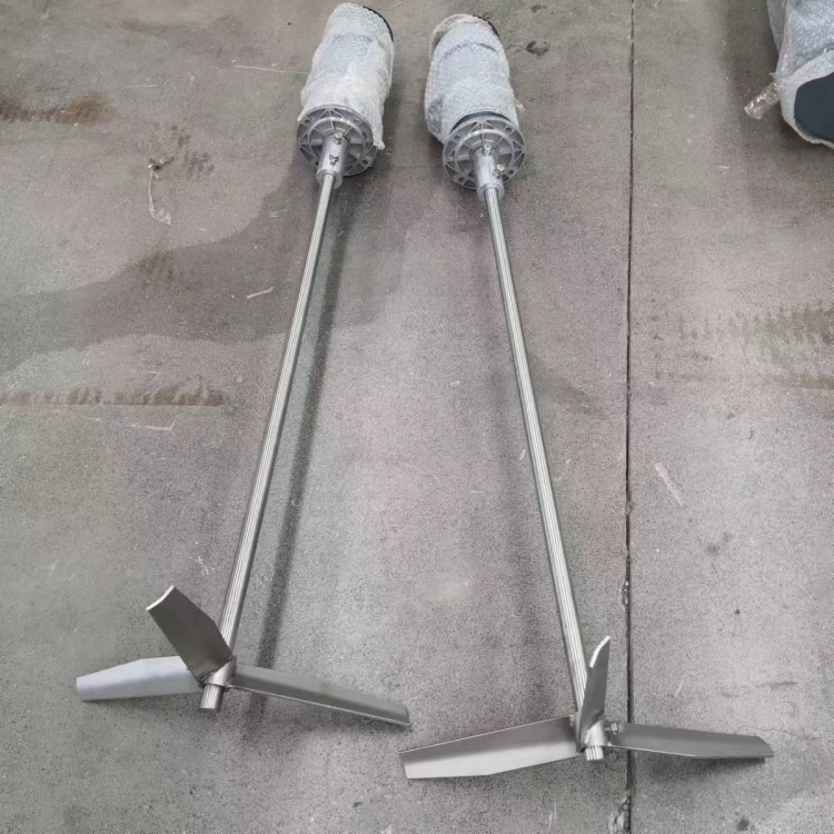 桨式搅拌机由电机减速机、搅拌轴、桨叶等组成,桨叶旋转后,投加药剂充分混合溶解,药剂分子与污水中有害物质迅速反应,达到去污消毒作用。