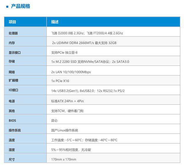 GM7-2602主板是采用飞腾D2000 8核(兼容 FT2000/4)处理器的Mini ITX主板,主频可达2.3/2.6 Ghz,此主板具备了国产安全自主可控产品的要求,产品性能***,可兼容市面主流的台式机和一体机机箱的装配,可***应用在国产领域行业市场中