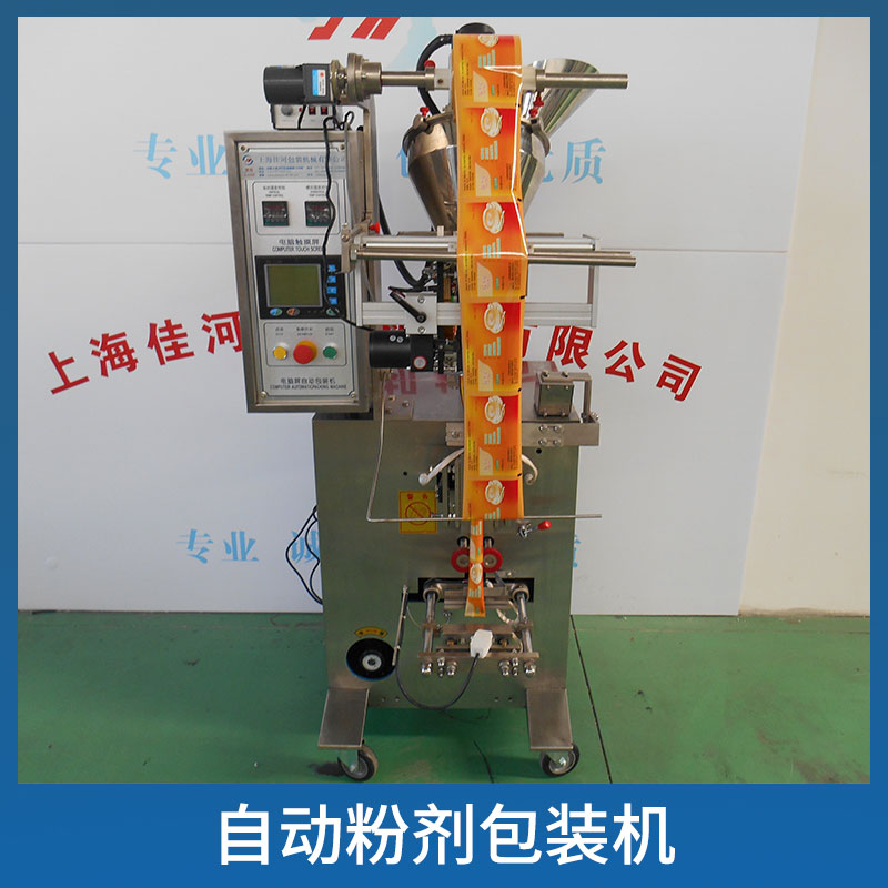 杭州自动粉剂包装机厂家供应_出售_批发_价钱【上海佳河包装机械有限公司】一、用途: 适用于粉末包装。 例如:中药粉、奶粉、豆奶粉、淀粉、咖啡粉、淀粉,胡椒粉,面粉,咖喱粉,芝麻糊,奶茶粉,五香粉、水泥粉、苏打粉、糖粉、面膜粉、地瓜粉、珍珠粉、工业粉末、农业粉末等等细颗粒状粉末状物料。 二、设备性能: 1、主控制器采用PLC控制,电机采用变频器调速,可在2个袋子长度内自动完成光电跟数字式自动调节光标方式,满足精准定位。彩色触摸屏幕人性化设计、操作界面明朗、参数设定简易。 2、整台设备均采用机械结构传动,运行平稳,无噪音,封口牢靠,袋子外形美 观;可精准完成制袋、计量、填充、封口、分切、计数、日期打印等功能。下料采用螺杆计量,可确保下料精准。 3、袋长可任意调整。