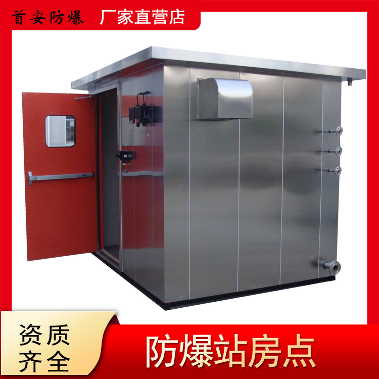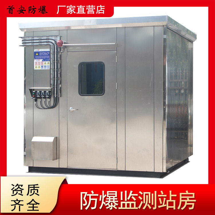 防爆监测站房就是是人们常说的防爆小屋,又叫防爆分析小屋。它是人们在石油化工环保等各行业中为检测有毒有害易燃易爆气体所设计制造的特殊房子,房子一般体积不大,多采用不锈钢或碳钢等钢材制作,房间内安装配电设备、照明设备、通风设备、分析仪等部件,如果作为临时避难的话,还要安装生命支持系统,语音联络监控系统等。防爆站房的材质采用1.2到1.5厚304不锈钢板制成,内墙一般采用1.2厚碳钢板或不锈钢板,不锈钢防爆站房底座采用12#U型槽钢焊接成型,底部焊接方管格栅,上方加焊防滑花纹钢板。不锈钢分析小屋在实用方面要优越于其他结构的分析小屋,具有更好的防腐、防潮等性能,现场安装更加方便,具有可回收性能,方便现场不使用可转移到别的地方。