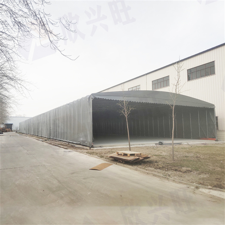 2、推拉雨棚稳固;镀锌钢管架子,钢部件连接,推拉遮雨棚,PVC篷布高频焊接,基座固定,力学性能。