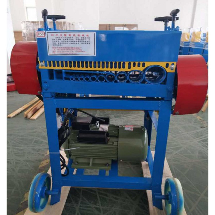 此剥线机的操作及结构简单、使用也方便、加工电缆单线铜丝可轧(剂压)或用刀片破开,其他电缆线必须用刀片破开绝缘层,然后将铜丝取出。 应用范围: 该机适用范围广、使用寿命长,能开各类电缆,高压电缆,光缆电线,轧轮上可压1.5mm以上单丝,护套扁线,钢丝等。电机械配置4×4三相。变速箱可调四档,快慢适合你生产的需要。(注:调档位时,先把一只手柄扳到空档。然后调另外一只,依次类推。(可剥直径?1.5~?70mm的电缆) 产品参数: 适用范围:直径1.5-70mm光缆,护套扁线,外包金属电缆线、钢丝线、橡胶电缆 线、高压电缆等。 功能:滚筒剂压,左右装刀(长形刀)上下装刀(圆形刀片) 尺寸:长77cm X宽55cm X高118cm 重量:21Okg 电压功率:220V/3KW 380V/3KW 380V/4KW 日产数量:200kg-3000kg