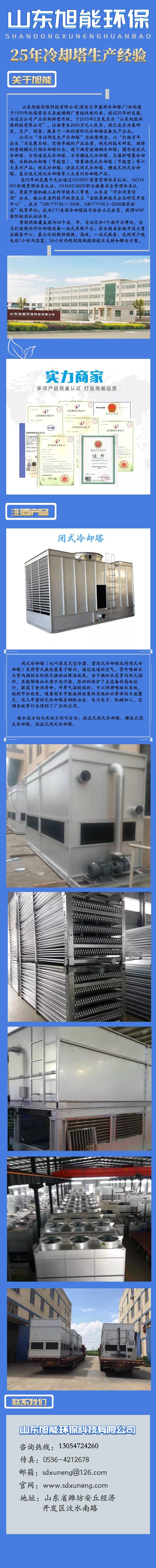 山东旭能环保科技有限公司(原安丘市盛源冷却塔厂)由创建于1979年的国营安丘县玻璃钢厂重组改制而来,经过25年的发展,为适应公司产业结构转型升级,于2015年2月更名为“山东旭能环保科技有限公司”,注册资本2000万元人民币,现已成长为集研发、生产、销售、服务于一体的国际化冷却塔设备生产企业。公司以“专注研发生产冷却塔”为经营理念,以“打造百年企业“为发展目标,凭借卓越的产品品质、领先的技术研发、独特的营销模式引领冷却塔行业。旗下拥有玻璃钢冷却塔:圆形逆流式冷却塔、方形逆流式冷却塔、方形横流式冷却塔、无填料喷雾冷却塔、水轮机冷却塔(节能型)、喷雾推进式冷却塔(节能型)等六大系列产品;闭式冷却塔:逆流式闭式冷却塔、横流式闭式冷却塔、复合流式闭式冷却塔等三大系列冷却塔产品。