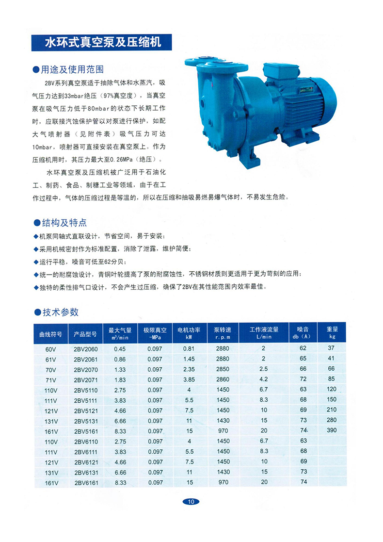 2BV系列真空泵适用于抽除气体和水蒸气,吸气压力可以达到33mbar绝压(97%真空度)。当真空泵在吸气压力低于80mbar 的状态下长期工作时,应联接气蚀保护管,以对泵进行保护。如配大气喷射器,吸气压力可达10mbar,喷射器可直接安装在真空泵上。作为压缩机用时,其压力至0.26MPa(绝压)。