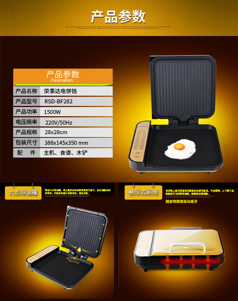 友情提醒:建议您通过拨打厂家联系方式确认最终价格,并索要荣事达悬浮式电饼铛 RSD-BF282_日用百货样品确认产品质量。如荣事达悬浮式电饼铛 RSD-BF282_日用百货报价过低,可能为虚假信息,请确认荣事达悬浮式电饼铛 RSD-BF282_日用百货报价真实性,谨防上当受骗。