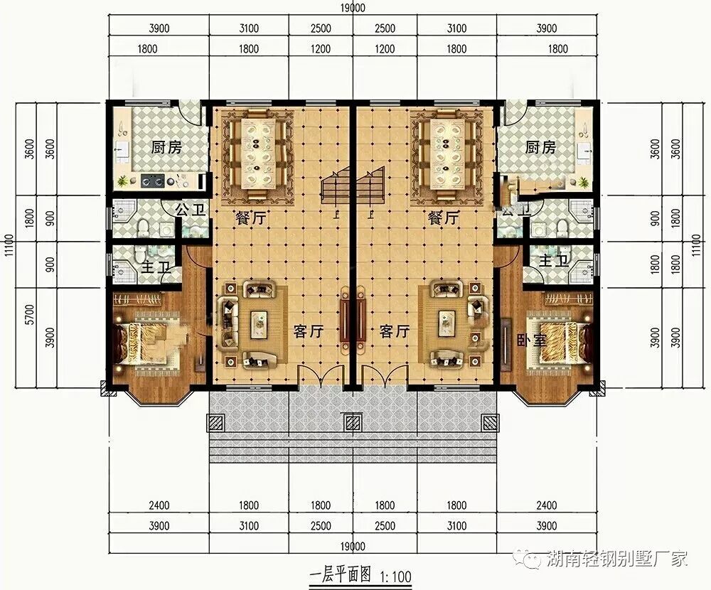 两户共用一堵墙,布局左右对称,入户即是客厅,厨房、餐厅布局合理,为了遵从当地风俗,后侧还留了一扇门。