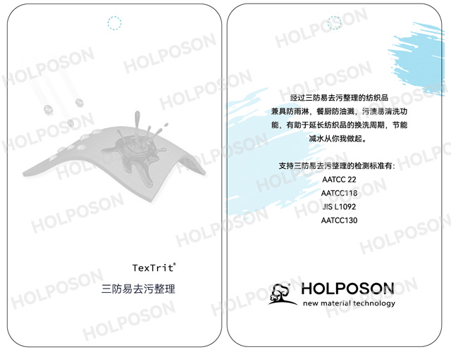 HOLPOSON® Smart Clean-T 亲水易去污整理剂 HOLPOSON® Smart Clean-T 是经过特殊改性聚酯类亲水易去污整理剂,能够赋予加工织物良好的亲水,抗静电,吸湿速干,蓬润性等性能,且耐洗性达50次以上(JIS L0217. 103法,连续洗涤法)经过易去污整理后的纺织品面料,在一定程度上可以清水擦除所沾污渍,如:酱油,番茄酱,玉米油,圆珠笔油污等。满足家庭主妇对浅色衣物易打理易清洁的要求。使难去除、易残留的脏污,可以去除干净,达到污所不落,节能去污。HOLPOSON® Smart Clean-T 适用于天然纤维、合成纤维及其混纺织物,目前易去污整理可用于开发浅色系列的童装面料,羽绒服面料,沙发面料,工装,职业装,衬衫,白T恤等等。