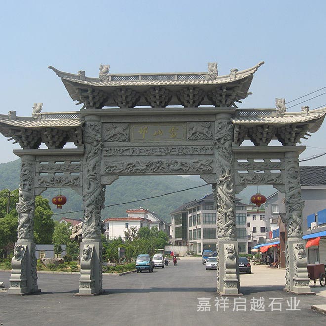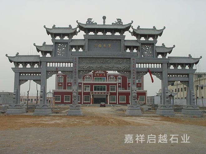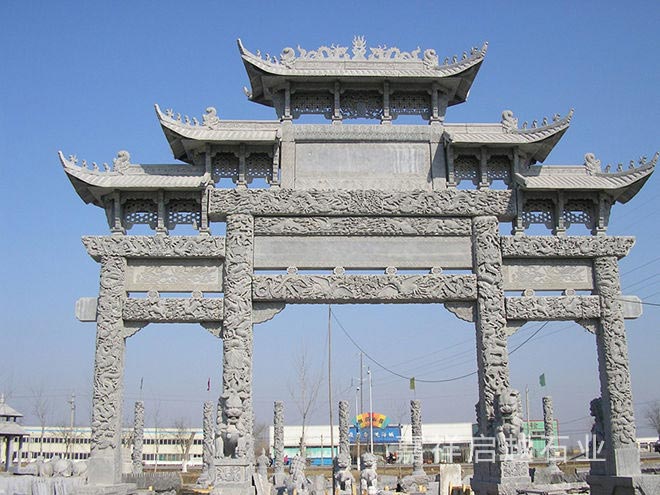 石牌坊加工设计其实在造型上也都有不少考虑,从现在牌坊的雕刻设计看,造型按照间楼是否高出两边分为"冲天式"以及"不出头式",其本身的设计也都会有一定不同,可以考虑建造区域的使用需求来搭配。