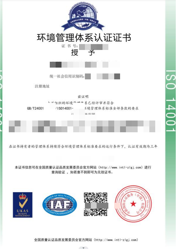 环境管理体系认证证书