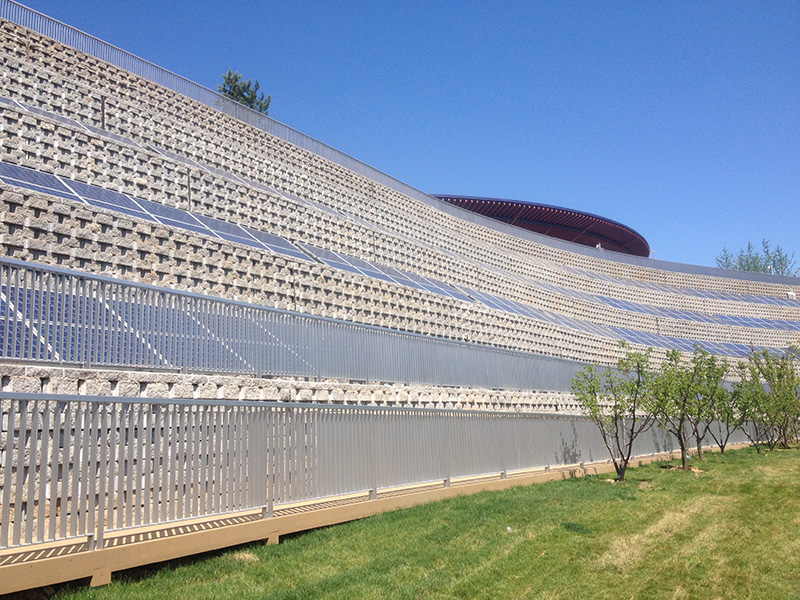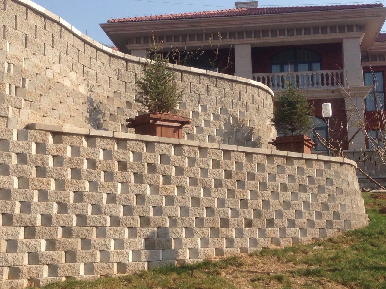.造型多变,主要为曲面型、直面型、景观型、植生型,自嵌式加筋挡土墙工程,可垒成直线或曲线,突出动态,给人以舒美的感觉,尤其在一些特殊的场合,自嵌式加筋挡土墙,如标志性广场、露天剧场、球场等,流畅的曲线使空间形成明显的视觉中心,有利于突出主体景物,给设计师和业主非常广阔的想象空间。
