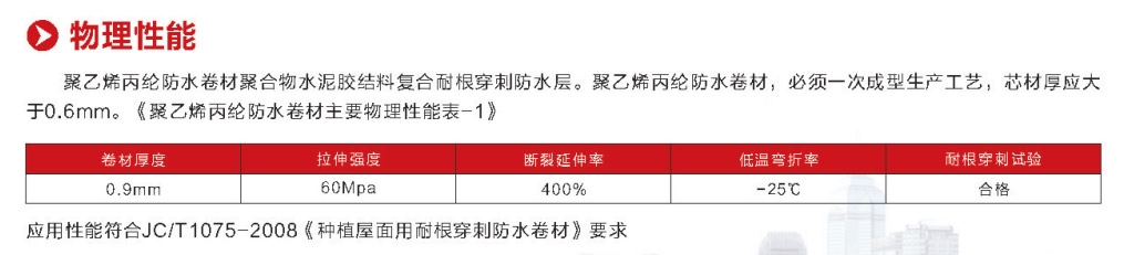 高分子聚乙烯丙纶耐根穿刺防水卷材是以改性合成高分子树脂防水林层为主阳根防水层,高强高韧长丝纤维织物为增强层,加入化学阻根剂,采用一次复合工艺制成的耐根穿刺专用防水卷材,与其相配套的自行研制的阻根型胶结料相粘合,形成牢固、可靠、耐根穿刺的高分子聚乙烯丙纶复合耐根穿刺防水系统。